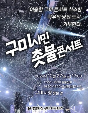 경북 구미시가 가수 이승환씨 콘서트를 취소하자, 시민단체가 구미시청 앞에서 촛불콘서트를 예고했다. '윤석열퇴진 구미시국회의'는 오는 27일 금요일 오후 5시 구미시청 정문 앞에서 '구미시민 촛불콘서트'를 연다고 24일 밝혔다. 구미시국회의는 이날 성명서를 내고 "이승환 구미 콘서트 취소한 극우의 도시를 거부한다"며 "구미시민 촛불콘서트를 열어 시민들의 제대로된 목소리를 들려줄 것"이라고 설명했다. 이들 단체는 "김 시장은 '공연 중 정치적 선동, 정치적 오해를 불러일으킬 언행을 하지 않겠다'는 서약서를 이승환씨에게 요구했다"며 "군