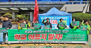 일하다가 다치거나 아파도 '산업안전보건법'의 보호를 받지 못하는 대구지역 노동자들이 있다. 행정과 사서 등 대구지역 학교 교육공무직 노동자들이다. 현행법상 이들은 산안법 적용 대상이 아니다. 같은 교육공무직 노동자여도 급식, 청소, 경비 노동자 등은 산안법 적용을 받아 법의 보호 테두리에 있지만 이들은 어떤 보호도 받지 못하고 있다. 때문에 현장 노동자들은 정부를 향해 "산안법 적용 전면 확대"를 촉구했다. 전국교육공무직본부 대구지부(지부장 서춘화)는 15일 오전 대구교육청 앞에서 기자회견을 열고 "대구지역 학교 교육공무직 직종 상
