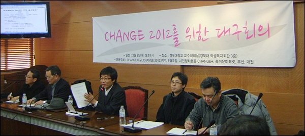 <체인지대구>와 <체인지광주연대>를 비롯한 전국 6개 지역의 8개 단체가 공동으로 주최한 '체인지 2012를 위한 대구회의'가 9일 오후 경북대학교에서 30여명이 참석한 가운데 3시간 가량 진행됐다. 이 날 회의에는 체인지대구 강금수 사무처장, 참여연대 김민영 전 사무처장, 광주NGO센터 서정훈 센터장, 부산시민센터 김해몽 센터장, 대전 디모스 정완숙 대표, 상지대학교 교양학부 정대화 교수, 광주환경운동연합 임낙평 공동의장이 참석해 각 지역의 시민정치조직을 대표해 발언했다.