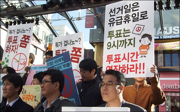 ▲ '투표시간 연장'과 '유급 휴일 지정' 촉구 피켓을 든 공동행동 회원(2012.11.1) / 사진.평화뉴스 김영화 기자