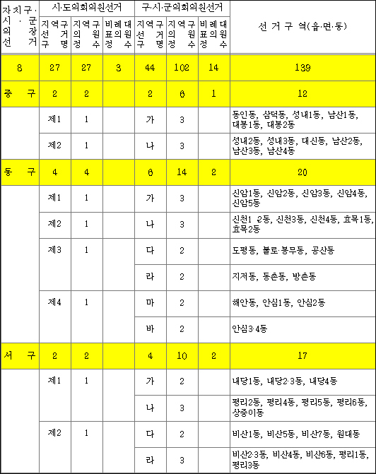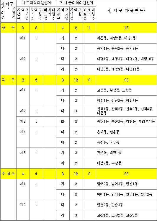 제6회 전국동시지방선거 대구광역시 선거구 및 의원정수 현황
