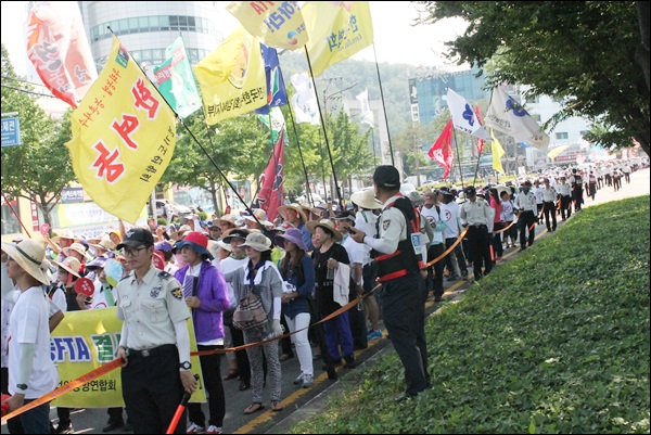 때문에 ▶한・중FTA 협상 중단 ▶농축산물 가격・농가소득 안정을 위한 보호대책 수립 ▶한・중FTA 협상에서 농업부분 제외를 촉구했다. 집회 후 이들 단체는 협상이 진행된 엑스코까지 1.3km가량 상복을 입고 한국 농업의 영정사진을 든채 1시간가량 행진을 벌였다. 또 '한중FTA'라고 새겨진 얼음조각을 망치로 깨뜨리는 퍼포먼스를 벌이기도 했다. 이어 협상장 앞에서 2차 규탄대회를 진행하려 했으나 4천여명의 경찰병력이 배치돼 협상장 근처에서 2시간가량 경찰과 대치했다.