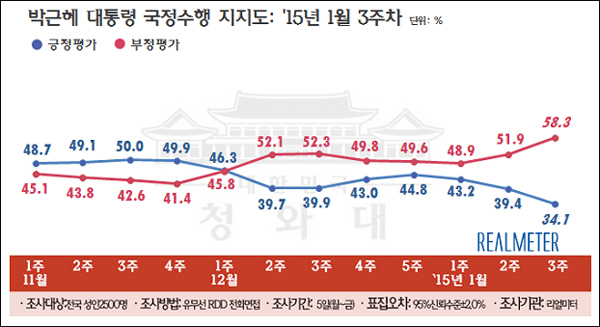 여론조사기관 리얼미터가 1월 19일부터 23일까지 전국 19세이상 유권자 2,500명을 대상으로 박 대통령 국정수행 지지도를 조사한 결과, '잘하고 있다'는 긍정평가는 일주일 전보다 5.3%P 떨어진 34.1%(매우 잘함 11.0%, 잘하는 편 23.1%)로, 지난주 경신했던 집권 후 최저치를 또 다시 경신했다.