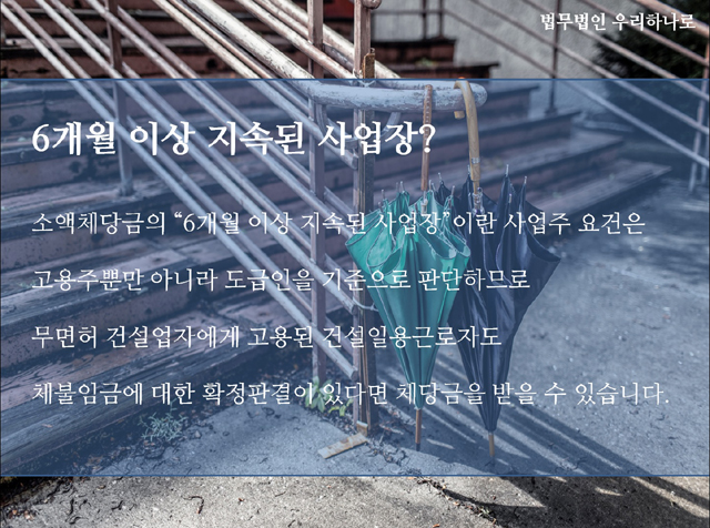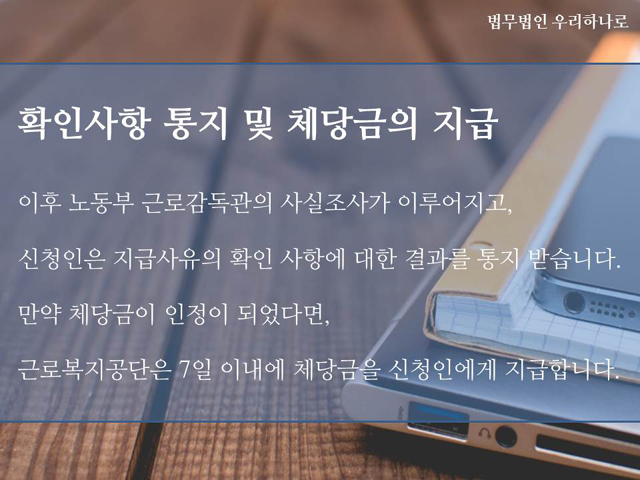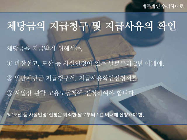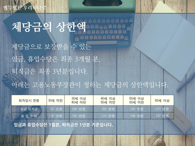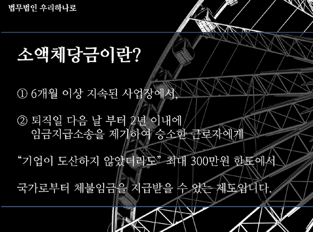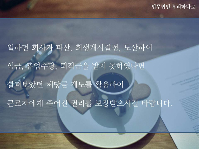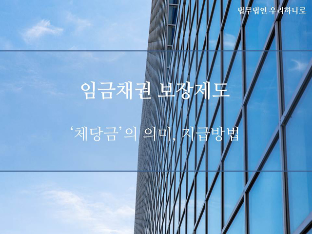 체당금이란 사업주가 도산 등으로 인하여 임금을 지급할 수 없는 경우, 고용노동부 장관이 사업주를 대신하여 일정 금액의 임금 및 퇴직금을 근로자에게 지급하여 주는 것으로서, 근로자의 최소한의 생활안정을 위한 제도입니다. 한편, 2015. 7. 1.부터 시행되고 있는 소액체당금제도는 기업이 도산하지 않은 경우에도 최대 300만원의 범위에서 근로자의 임금을 보호해 주고 있습니다. 카드뉴스를 통하여 체당금 및 소액체당금의 지급요건 및 신청방법에 관하여 정리해 보았습니다.