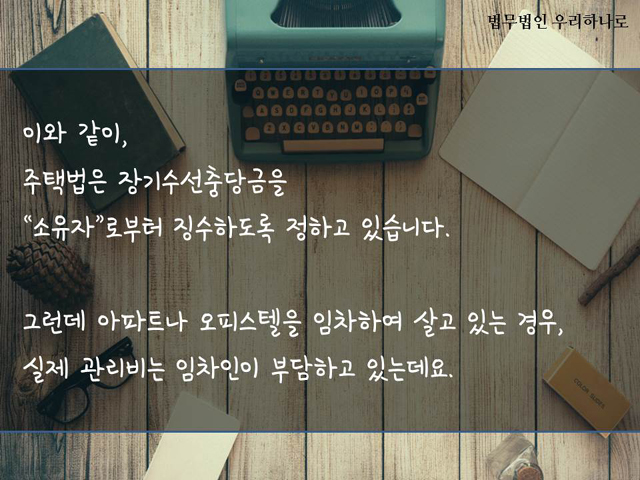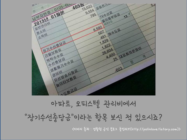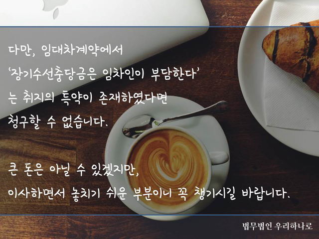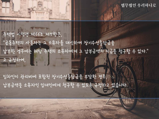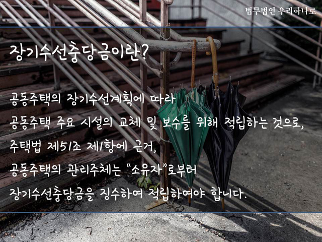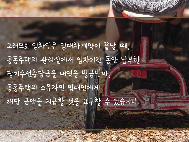 장기수선충당금이란 공동주택에 있는 주요시설의 교체 및 보수를 위해 적립하는 금원으로 그 법적근거는 주택법 제51조 제1항에 있습니다. 주택법상 장기수선충당금은 관리주체가 전유부분의 "소유자"로부터 적립해야 하는 것임에도, 일반적으로 관리비에 포함되어 고지되기 때문에 임차인 부담하는 경우가 많은데요. 카드뉴스를 통하여 임차인이 소유자로부터 장기수선충당금을 받을 수 있는 경우와 주의점에 대하여 정리해보았습니다.