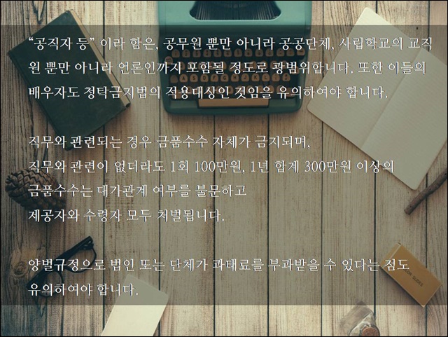 '부정청탁 및 금품둥 수수의 금지에 관한 법률'인 소위 '김영란법'이 오는 9월 28일부터 시행됩니다. 김영란법은 기본적으로 공무원 등에 대한 부정한 청탁과 공무원 등에 대한 금품의 수수를 금지하는 법입니다. 누구나 한번 쯤은 김영란법을 들어보았겠지만 그 구체적인 내용과 규정체계는 생소한 분들이 많을 것입니다. 카드뉴스를 통하여 김영란법의 주요내용과 규정체계와 주의할 점 등을 정리해 보았습니다.