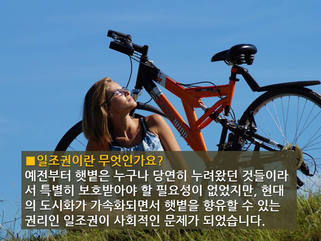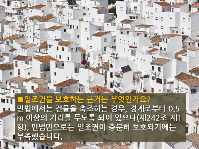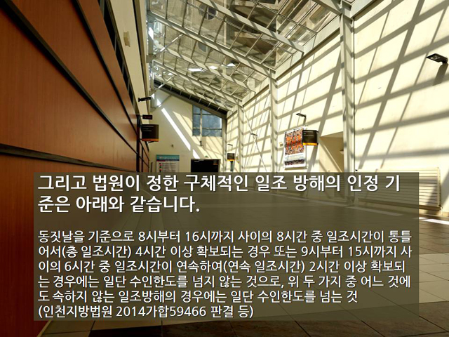 일조권(日照權)이란 햇볕을 향유할 수 있는 권리를 말합니다.