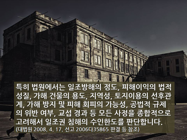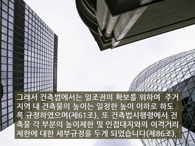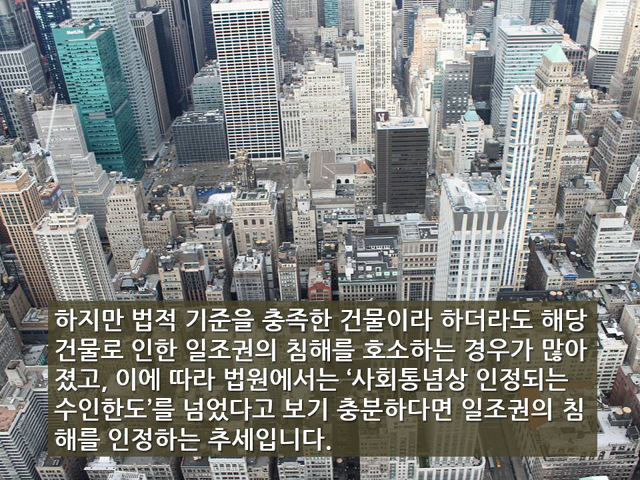 아파트의 일조권은 쾌적한 주거환경의 핵심요소 중 하나로서 주거의 입지나 가격에 커다란 영향을 미치고 있는데요. 이러한 일조권을 보호하기 위해서 우리 건축법령은 건축물에 대하여 일정한 제한을 가하고 있고, 법원은 일조권 침해가 일정한 수인한도를 초과하는 경우 이를 위법하다고 보아 손해배상 등의 제재를 가하고 있습니다. 카드뉴스를 통하여 일조권의 보호에 관한 각종 법령과 법원의 입장을 정리해 보았습니다.
