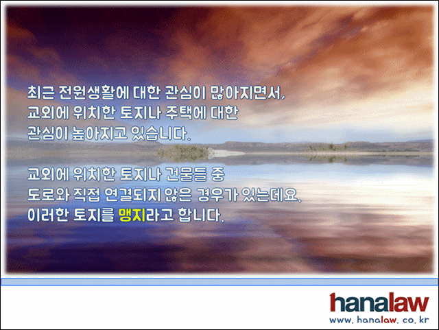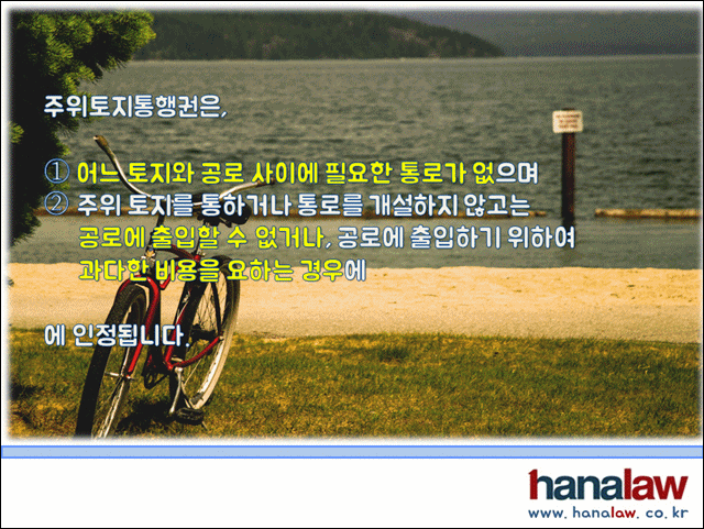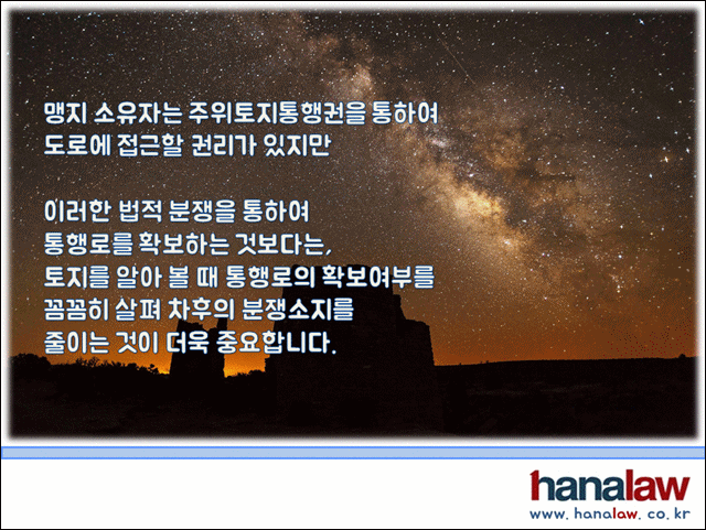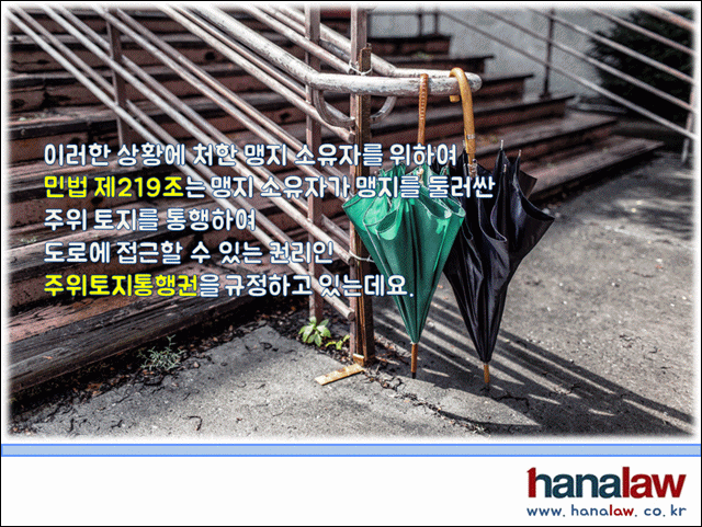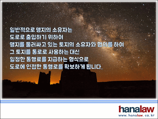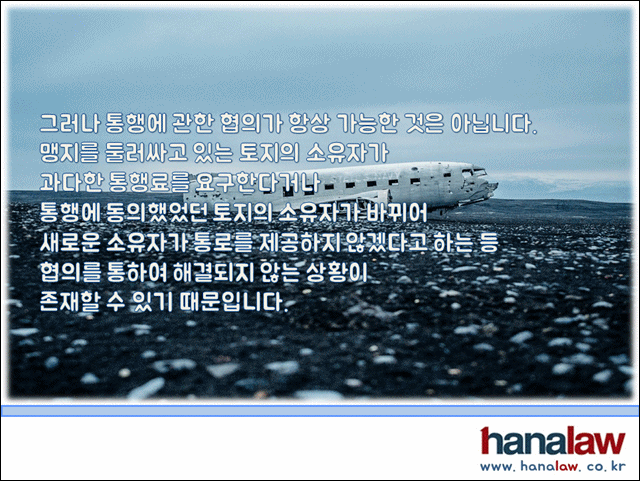 공도로 통하는 도로가 없는 토지를 맹지라고 합니다. 이 경우 맹지의 소유자가 도로로 통하는 통로를 확보하기 위해서는 주변 토지를 통로로 활용할 수 밖에 없는데요. 주변 토지를 통로로 활용하는 방법은 주변 토지 소유자의 협상으로도 가능하겠지만, 주변 토지 소유자가 이를 거부하면 참으로 답답한 상황이 연출됩니다.