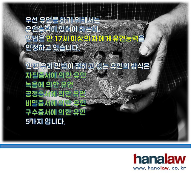 우리 헌법은 재산권의 내용 중 하나로서 사적처분의 자유를 인정하고 있고, 이러한 재산처분의 자유가 사망 단계에서 발현되는 것이 유언의 자유입니다. 그러나 유언은 유언자가 사망한 후에 그 효력이 발생하기 때문에 유언의 존재와 내용을 두고 다툼이 발생할 소지가 많습니다. 이에 우리 민법은 유언의 방식을 5가지로 법정해 놓고, 각 방식에 따라 엄격한 절차와 방식을 거칠 것을 요구하고 있는데요. 카드뉴스를 통하여 우리 민법이 규정하고 있는 유언의 방식과 주의점을 정리해 보았습니다.