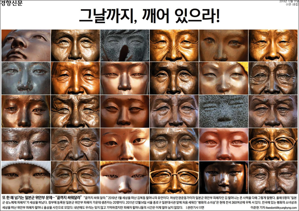 <경향신문>은 '그날까지, 깨어 있으라!'는 큰 제목으로 전국에 있는 평화의 소녀상과 세상을 떠난 위안부 피해자 할머니들의 흉상을 담았다. 사진 설명에는 '또 한 해를 넘기는 일본군 위안부 문제'와 함께 "끝까지 싸워달라"는 고 김복동 할머니의 유언을 적었다.