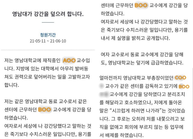 경북 경산에 있는 영남대의 A 여성 교수는 "영남대가 강간(성폭행)을 덮으려 합니다"라는 제목의 글을 지난 11일 청와대 국민청원 홈페이지에 썼다. A교수는 "동료 교수로서 같은 00센터에서 일하던 B(남성) 교수에게 강간 당했다"며 "말하는 게 죽기보다 수치스러운 일이지만 용기 내 공개한다"고 밝혔다.