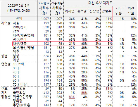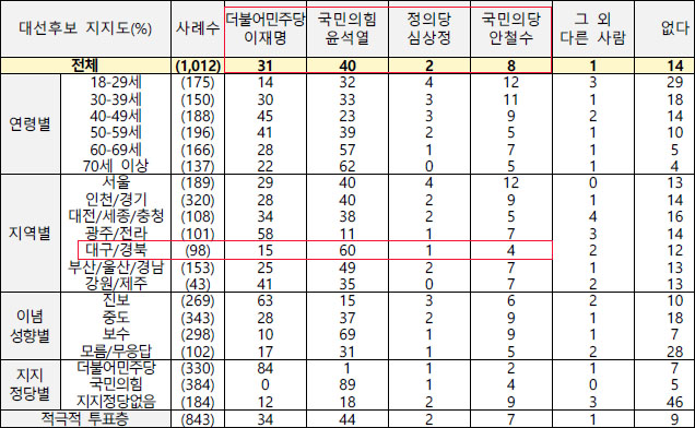 조사기관별 대구경북 지지율을 보면 ▶지상파 방송3사는 윤석열 59.7%, 이재명 19.4%였고 ▶한국갤럽은 윤석열 60%, 이재명 21% ▶리서치뷰는 윤석열 65%, 이재명 30% ▶NBS는 윤석열 60%, 이재명 15%로 나타났다.