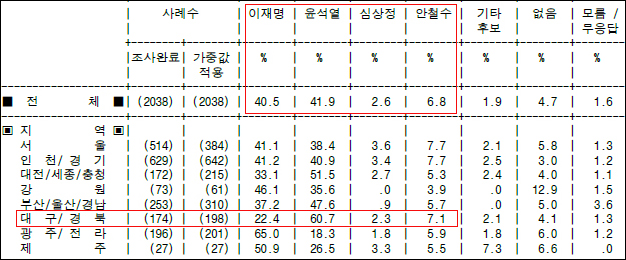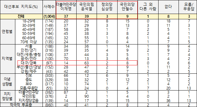 그러나 보수성향이 강한 대구경북은 윤석열 후보가 60% 안팎의 지지율을 보이며 이재명 후보를 크게 앞선 것으로 나타났다.