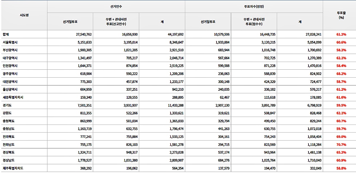 전국에서는 전남이 70.7%로 가장 높다. 이어 전북 69.0%, 광주 68.2%, 경북 65.2%, 대구와 강원이 각각 62.1%, 세종 61.6%, 울산 61.2%, 경남 60.9%, 충북 60.7%, 서울 60.6%, 충남 59.7%, 경기 59.5%, 제주 58.8%, 대전 58.7%, 인천 58.4%다. 부산이 58.2%로 투표율이 가장 저조했다.