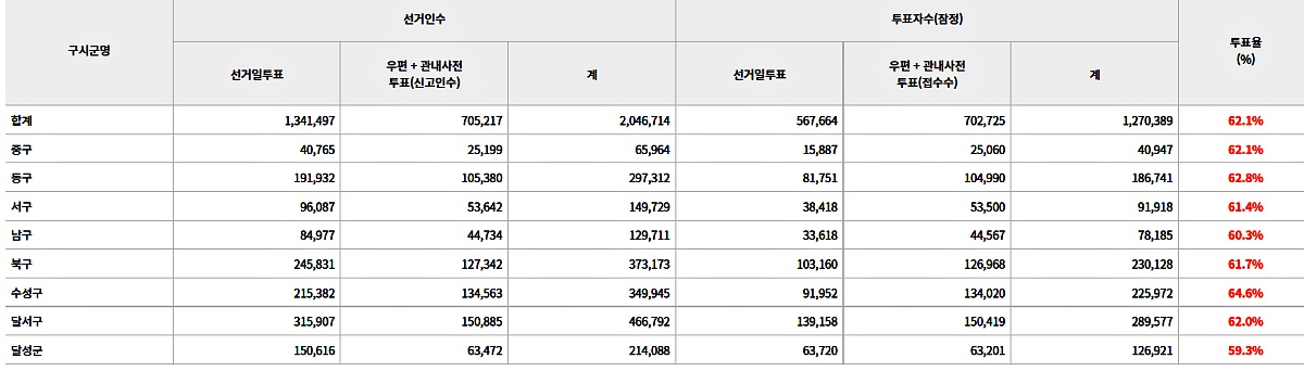 지역별로는 수성구가 64.6%로 가장 높고, 달성군이 59.3%로 가장 낮다. 국회의원 보궐선거가 있는 중구는 62.1%, 남구는 60.3%다. 이어 동구 62.8%, 달서구 62.0%, 북구 61.7%, 서구 61.4%다.