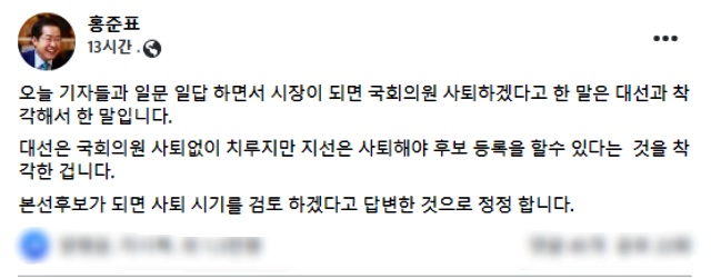 31일 오후 늦게 홍 의원은 본인 페이스북 계정에 "오늘 기자들과 일문 일답을 하면서 시장이 되면 국회의원 사퇴하겠다고 한 말은 대선과 착각해서 한 말"이라며 "대선은 국회의원 사퇴 없이 치르지만 지선은 사퇴해야 후보 등록을 할 수 있다는 것을 착각한 것"이라는 내용의 글을 올렸다.