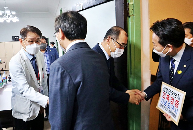 ▲ 김용림 병원장, 홍원화 총장과 악수하는 민주당 의원들(2022.4.15) / 사진.평화뉴스 김영화 기자