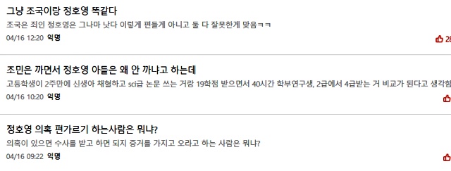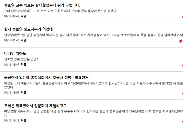 후보자의 반박 기자회견에도 불구하고 비판은 안팍에서 거세다. 특히 경북대학교 학생들이 본인 인증을 하고 가입할 수 있는 '에브리타임' 사이트에는 정 후보자를 비판하는 게시글이 수십건 올라왔다.