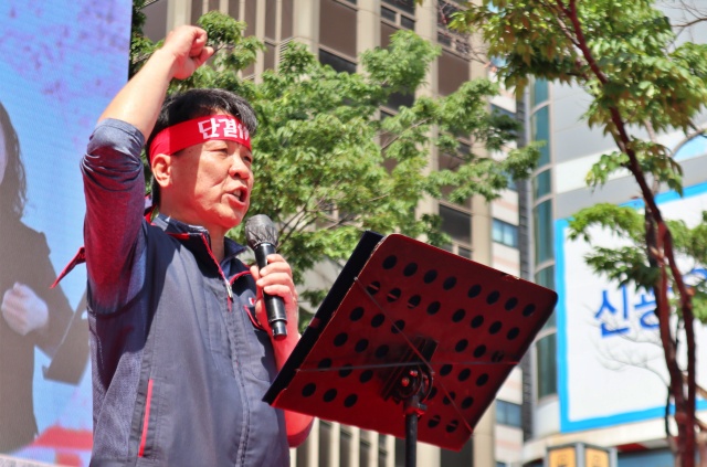 ▲ 이길우 민주노총대구본부장이 무대에서 연설 중이다.(2022.5.1) / 사진.평화뉴스 김영화 기자