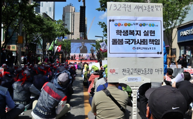 ▲ "학생 복지 실현하라" 전교조대구지부 조합원들의 피켓팅(2022.5.1) / 사진.평화뉴스 김영화 기자