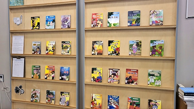 ▲ 통일부에서 대여해 준 북한 어린이 도서 30권이 대구 책방에 전시됐다.(2022.5.4) / 사진.평화뉴스 김영화 기자