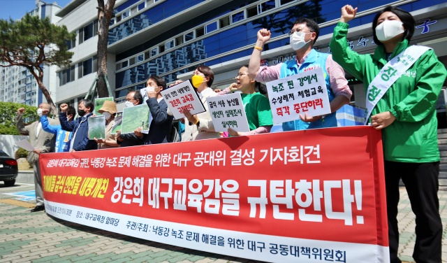 공대위는 "낙동강 4대강 보가 들어선 뒤 매년 낙동강에서 녹조가 피고 있고, 이 물로 키운 농작물에서 발암과 생식동성물질 마이크로시스틴이 검출됐다는 발표가 나온 지 두달이 훌쩍 넘었다"며 "이에 대해 지역 시민사회는 강은희 교육감에게 급식 안전 관련 안전 대책을 요구했지만, 강은희 교육감과 대구교육청은 이렇다 저렇다 답변 없이 아이들 밥상 안전 문제를 외면하고 있다"고 비판했다.