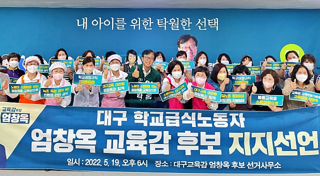 대구학교비정규직연대회 3개 학교비정규직노조(공공운수노조 교육공무직본부 대구지부, 전국여성노조대구지부, 전국학교비정규직노조대구지부) 조합원 4,500여명은 지난 16일 엄 후보 지지를 선언했다. 지역 일부 학교급식노동자(영양사·조리사·조리실무원)들과 학교운동부지도자들도 지난 19일 지지선언했다. 급식노동자들은 "산재 위험에 노출됐음에도 강 교육감은 노동자 수를 증가하지 않고 있다"며 "노동자 안전을 약속한 엄 후보를 지지한다"고 밝혔다. 학교운동부지도자들은 "매년 1년 단위 근로계약에 불안한 노동자들에게 고용안전을 약속한 엄 후보를 지지한다"고 했다.