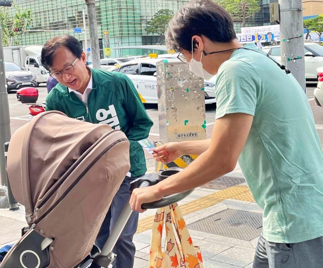 ▲ 엄창옥 교육감 후보가 선거운동 중 아이와 인사를 하고 있다. / 사진.엄창옥 캠프