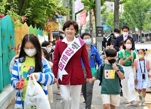 ▲ 강은희 대구교육감 후보가 공식 운동 첫 날 등교길에서 유세 중이다.(2022.5.19) / 사진.강은희 캠프