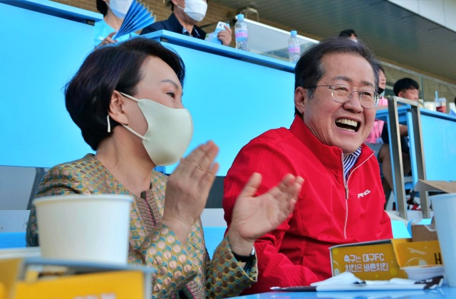 한편, 홍 후보는 22일 대구FC와 강원FC의 경기를 보기 위해 대구FC 홈구장인 DGB대구은행파크를 찾아 경기를 직관했다. 이날 대구FC는 강원을 3대 0으로 완파했다. 대구FC는 2021년 K-리그 3위를 기록한데 이어 FA컵 우승컵을 들어올렸고 아시아 챔피언스리그에 진출하는 등 좋은 성적을 보였다.