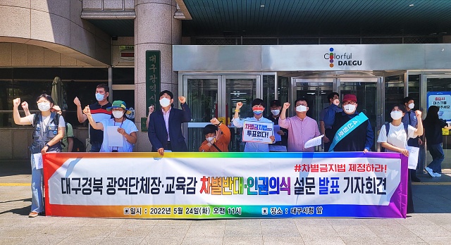대구시민단체연대회의·무지개인권연대 등 지역 24개단체가 모인 '대구경북차별금지법제정연대'는 24일 대구시청 앞에서 기자회견을 열고 6.1 지방선거에 출마한 대구경북 광역단체장·교육감 후보들을 상대로 '차별반대·인권인식 설문조사' 결과를 발표했다. 설문 대상은 대구시장 후보 4명과 대구교육감 후보 2명, 경북도지사 후보 2명과 경북교육감 후보 3명 등 모두 11명으로 지난 18일~23일 조사했다.