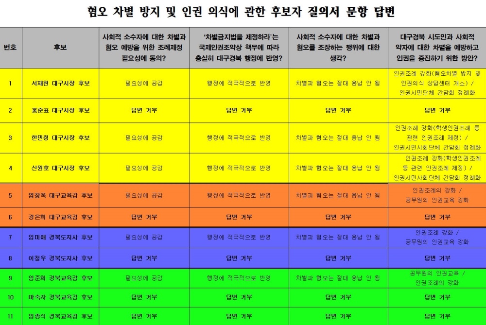 질의 결과, 대구시장 후보 4명 중 더불어민주당 서재헌(43), 정의당 한민정(49), 기본소득당 신원호(36) 후보 등 3명은 '사회적 소수자 차별·혐오 예방조례 제정 필요성 공감', '차별금지법 행정 적극 반영', '차별·혐오 절대 용납 안됨', '인권조례 강화·인권시민사회단체 간담회 정례화'를 답변서로 냈다.
