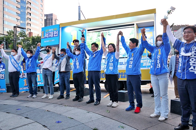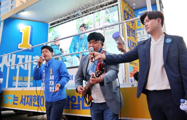 서재헌 후보도 마이크를 잡았다. 그는 "대구에 민주당이 없어지면 잘 살겠나. 아니다. 이번 선거는 민주당을 위한 선거가 아니라 시민을 위한 선거"라며 "잘 사는 대구를 위해 대구에도 파란색이 있어야 한다. 정치 경쟁을 시켜야 정치인들이 능력을 더 발휘한다"고 강조했다. 이어 "빨간색 옷 입은 후보들은 목이 터져라 유세를 하지 않는다"면서 "정치인만 행복하고 시민들만 대구를 걱정하는 그런 대구를 바꿔야 한다. 40년 평생 대구에 산 40대 청년 시장에게 한 표를 달라"고 호소했다.
