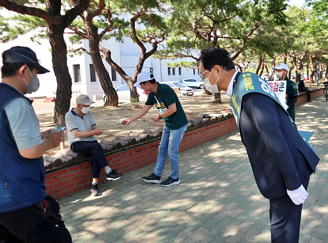 ▲ 명함을 나눠주며 지지를 호소하는 엄창옥 후보(2022.5.31) / 사진.평화뉴스 김영화 기자