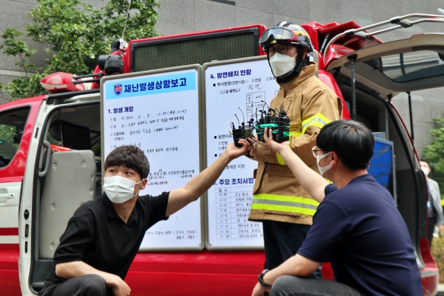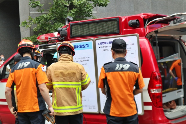 ▲ 현장 상황보고판을 보며 논의하는 소방, 경찰 관계자들(2022.6.9) / 사진.평화뉴스 김영화 기자