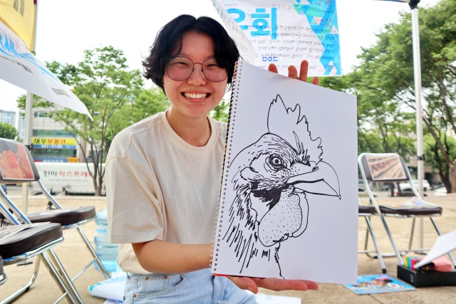 ▲ "치킨이 아니라 섬세한 생명체"...김강산씨의 닭 그리기(2022.7.6) / 사진.평화뉴스 김영화 기자