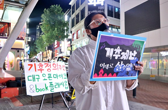 대구환경운동연합과 생명평화아시아, 대구녹색소비자연대 등 44여개 단체가 모인 '대구기후위기비상행동' 소속 청년 활동가들과 일반 시민 등 10여명은 지난 21일 오후 7시 2시간 가까이 동성로 옛 대구백화점 앞 야외광장 일대에서 기후정의 주간을 맞아 대구 오픈마이크·북 플래시몹을 진행했다.