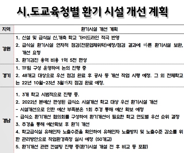 전국 17개 시·도교육청을 상대로 강 의원이 환기시설 개선 계획을 받아본 결과, 서울·경남·충남·광주교육청 등 모두 4개 시·도교육청만 개선 시범사업을 진행하거나 개선 계획을 수립한 것으로 나타났다. 환시시설 개선 조치가 완료된 학교는 한 곳도 없는 것으로 집계됐다.