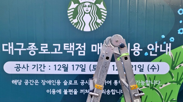대구 중구 진골목에 있는 스타벅스 종로고택점은 지난 17일부터 오는 21일까지 닷새동안 장애인용 슬로프(경사로) 공사를 진행하는 것으로 20일 확인됐다. 스타벅스 측은 종로고택점 입구에 '대구 종로고택점 매장 이용 안내문'을 붙이고, 공사 기간을 공지했다. 또 "해당 공간은 장애인용 슬로프(경사로) 공사를 위하여 통행이 불가능하다"며 "이용에 불편을 끼쳐 죄송하다"고 알렸다.