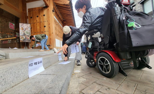▲ "차별입니다"...휠체어 탄 장애인이 종로고택점에 붙인 경고문(2022.11.28) / 사진.평화뉴스 김영화 기자
