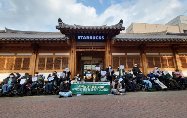 앞서 10월 김시형(38.뇌병변장애1급) 대구사람장애인자립생활센터 권익옹호팀장과 노지성(28) 대구권익옹호활동가 자조모임 '삐장' 활동가는 스타벅스 종로고택점을 찾았다가 휠체어 경사로가 설치되지 않아 "다른 매장을 이용해 달라"는 요구를 받고 매장 앞에서 발걸음을 돌렸다.