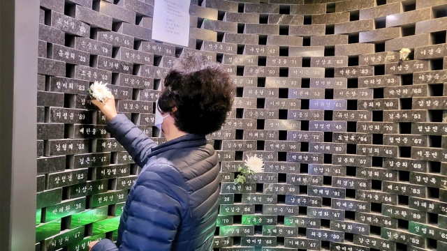 ▲ 희생자들 이름에 국화꽃을 헌화하는 시민(2023.2.17) / 사진.평화뉴스 김영화 기자