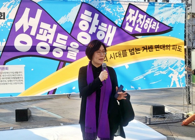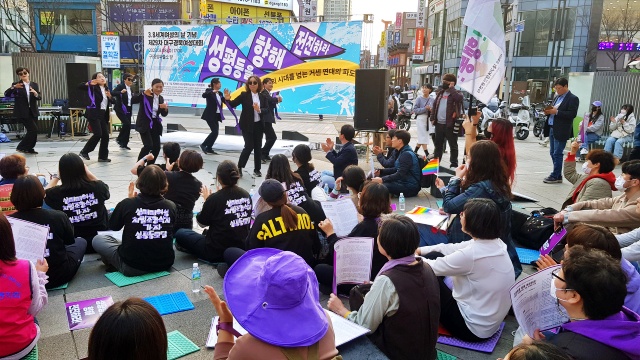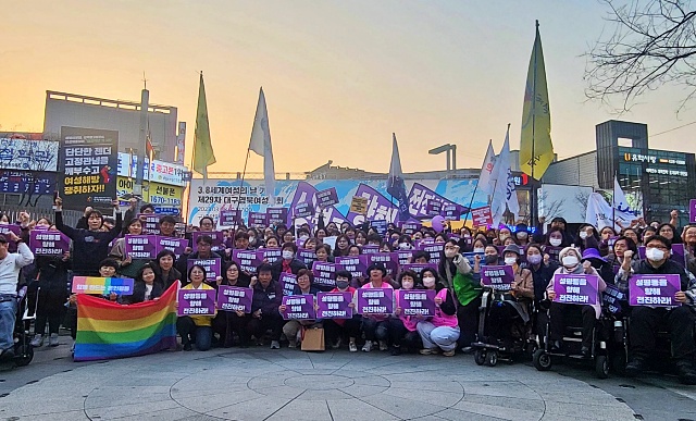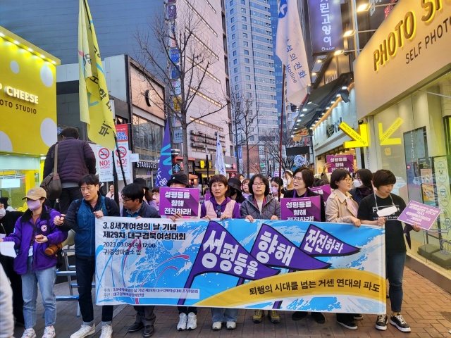대구경북여성단체연합 등 31개 시민사회단체·정당이 참가하는 '3.8세계여성의 날 기념 제29차 대구경북여성대회 조직위원회(위원장 남은주)'는 8일 오후 5시부터 2시간 넘게 대구 중구 옛 중앙파출소 앞 광장에서 '성평등을 향해 전진하라, 퇴행의 시대를 넘는 거센 연대의 파도'를 주제로 대구경북여성대회를 열었다. 이날 광장에는 주최 측 추산 170여명의 시민이 모였다.