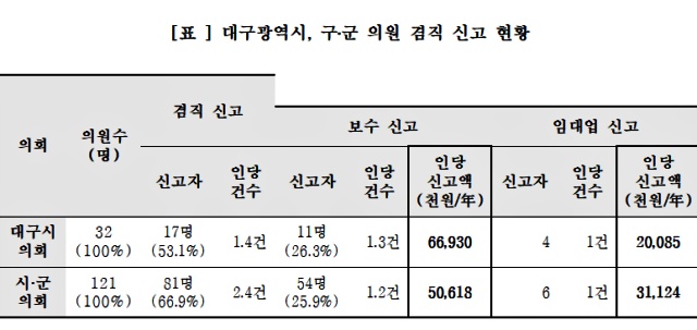 조사 대상은 대구시의원 32명과 8개 구.군의회 121명 등 광역·기초의원 등 153명이다. 조사 결과 대구시의원 32명 중 17명, 기초의원 121명 중 81명이 겸직을 신고했다. 겸직율은 대구시의원 53.1%, 기초의원 66.9%다. 기초의원의 겸직율이 조금 더 높지만 2명 중 1명 꼴로 비율은 비슷했다.