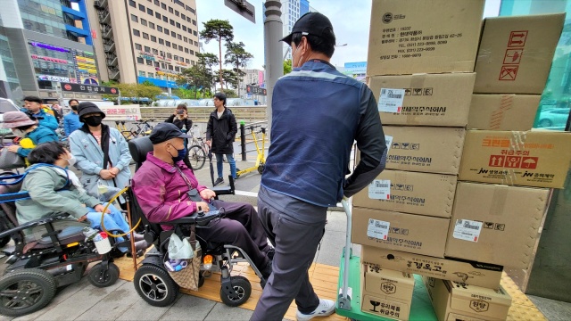 박명애(68) 420장애인차별철폐대구투쟁연대 상임공동대표는 18일 오후 대구 지하철 2호선 반월당역사에 가기 위해 엘리베이터(승강기) 앞에 섰다. 휠체어를 타는 박 대표는 다른 사람처럼 줄을 섰다. 휠체어가 타면 다른 사람들이 함께 타기 불편해 먼저 3번을 보내고 다음 차례를 기다렸다.