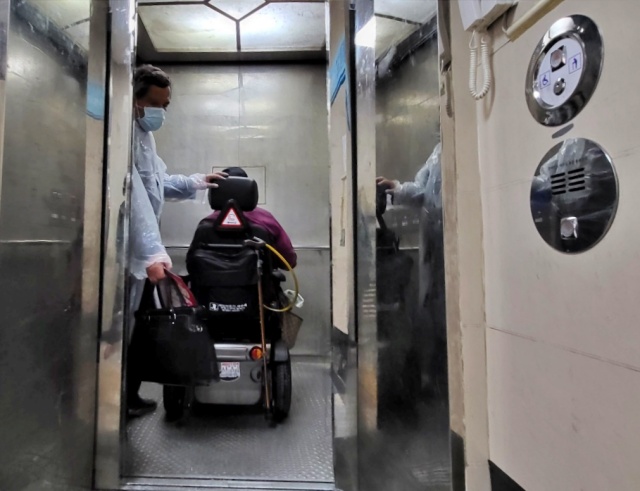 드디어 지상에서 한번 휠체어를 타고 엘리베이터에 오를 수 있었다. 비좁은 엘리베이터에 탈 수 있는 휠체어는 하나 뿐, 다른 휠체어 장애인들은 하염 없이 지상에서 다음 순서를 기다렸다.