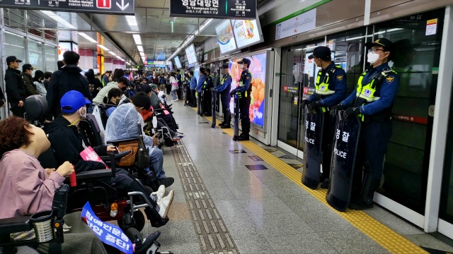 ▲ 승강장 앞 경찰들이 방패를 들고 스크린도어를 지키고 있다.(2023.4.18) / 사진.평화뉴스 김영화 기자
