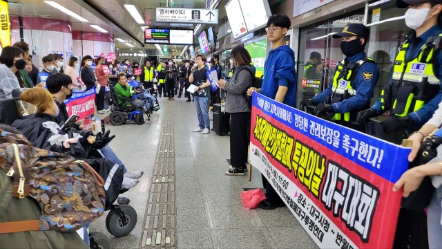 영남대방면 지하철 승강장 앞에 휠체어 장애인들이 길게 줄을 섰다. 지하철이 도착하고 스크린도어가 열리면서 시민들이 내리자 피켓을 들고 구호를 외쳤다. "윤석열 정권 장애인 운동 탄압 중단", "수용시설 노, 자립생활 예스", "장애인 권리 보장하라", "이동권 확대하라" 등이다.