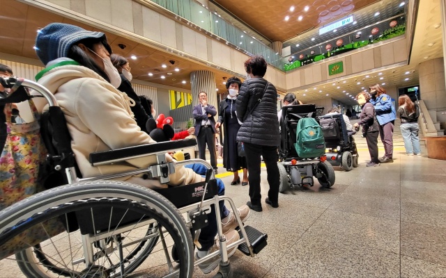 ▲ 전동휠체어를 타고 달서구청을 찾은 중증중복 장애인들(2023.4.27) / 사진.평화뉴스 김영화 기자